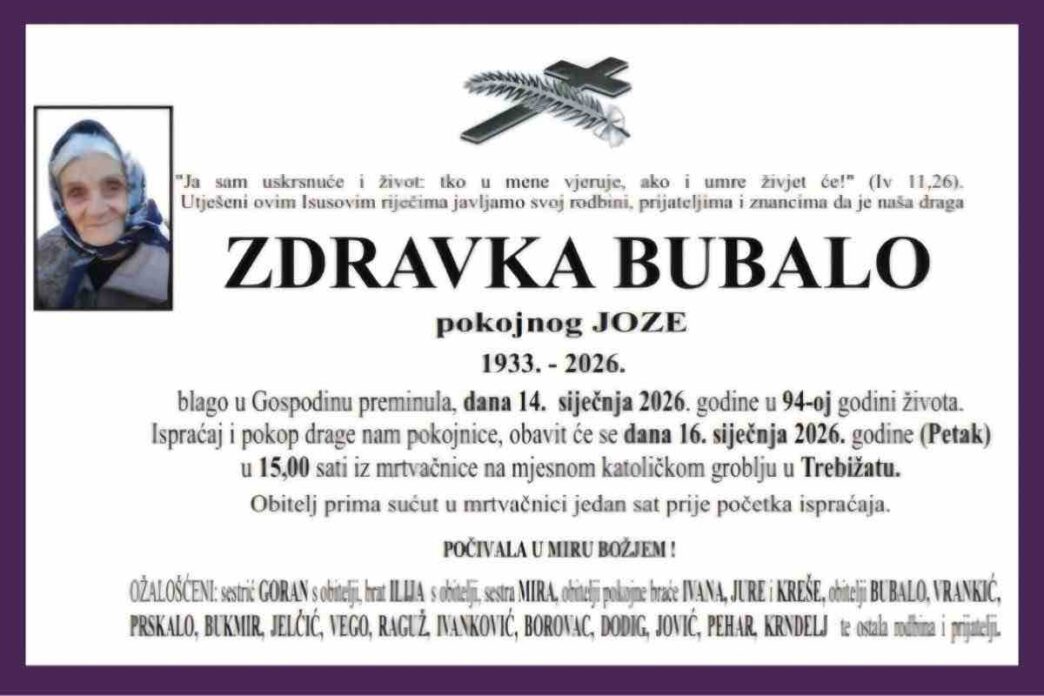 La morte, avvenuta in data odierna, 14 gennaio 2026, interrompe il tempo, ma non cancella ciò che è stato. L’eredità più grande che Zdravka lascia non è materiale, ma umana: l’impronta lasciata nelle relazioni, negli affetti, nei cuori. Oggi resta il dolore, ma anche la gratitudine per aver condiviso un tratto di strada insieme.