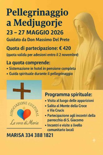 Pellegrinaggio a Medjugorje dal 23 al 27 maggio con aereo Napoli-Dubrovnik con sistemazione in pensione completa.