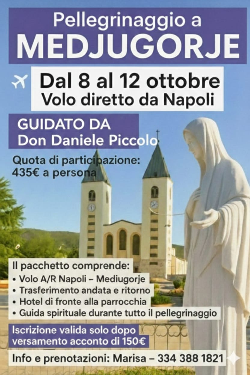 Pellegrinaggio a Medjugorje dal 8 al 12 ottobre con aereo Napoli-Spalato con sistemazione in pensione completa.