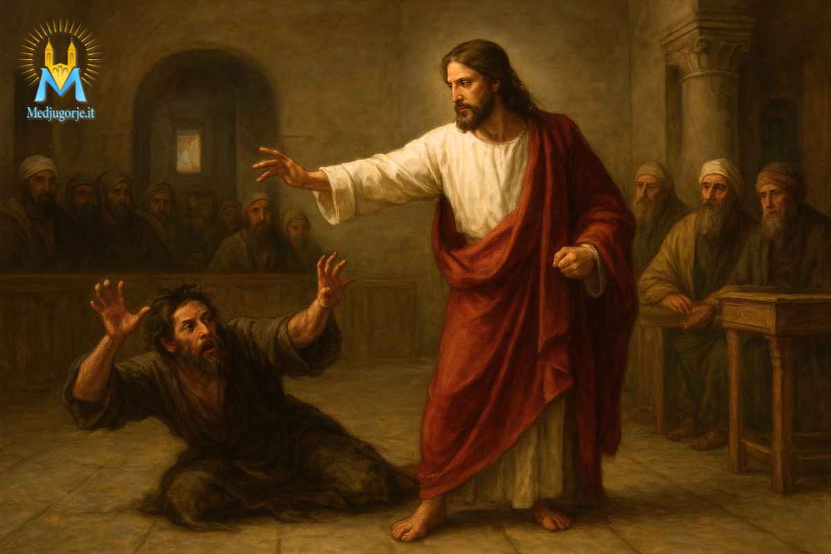 Gesù non dialoga con il demonio, ma lo zittisce e lo scaccia. È segno che la liberazione non nasce dal compromesso, ma dall’autorità della parola di Dio. Come insegna la Chiesa, Cristo è venuto a liberare l’uomo dal potere di satana ed a ristabilire l’amicizia con il Padre, offrendoci la grazia e i sacramenti come armi spirituali.