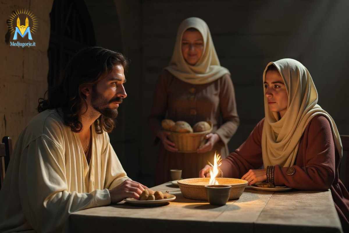 È una scena familiare, semplice, ma densa di significato spirituale. Gesù non contrappone l’azione alla contemplazione, ma mostra che ogni servizio autentico nasce dall’ascolto della Parola. Marta rappresenta l’impegno, la dedizione concreta; Maria la disponibilità del cuore a lasciarsi raggiungere da Dio. Entrambe amano Gesù, ma solo chi prima si siede ai suoi piedi può poi servirlo con pace e libertà. Questo episodio ci invita a rivedere le nostre priorità e a riscoprire ciò che davvero “non ci sarà tolto”.